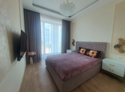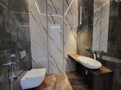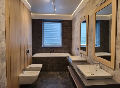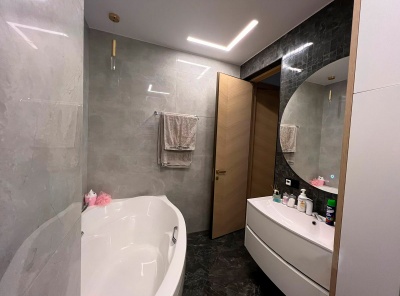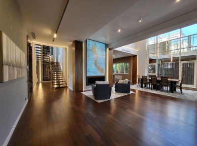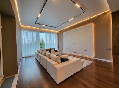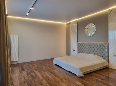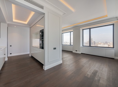 Аренда 5-комнатной квартиры площадью 250 кв.м. Метро Белорусская, 11 минут пешком. Большой Тишинский переулок, дом 10с1. ЖК Дом на Тишинке. Квартира полностью меблирована, имеется вся бытовая техника, а также система кондиционирования воздуха. Ремонт выполнен в современном стиле из дорогих материалов. Окна выходят во все стороны (панорамный вид на всю Москву). Застекленная лоджия. 2 машиноместа в подземном паркинге включены в стоимость.Планировка: гостиная-столовая-кухня, 4 спальни, 4 с/у - 3 полных и 1 гостевой, 2 гардеробных комнаты.