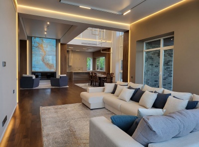 Продажа загородного дома общей площадью 550 кв.м. Новорижское шоссе, 19 км от МКАД. Коттеджный поселок Миллениум парк. Дом построен в 2 этажа. Панорамное остекление гостиной - второй свет высотой 11 метров. Камин с витриной из цельного оникса. Профессиональная система вентиляции, кондиционирования и увлажнения воздуха. Новый дизайнерский ремонт. Большие комнаты. Много простора и света. Участок 11 соток с готовым ландшафтным дизайном.