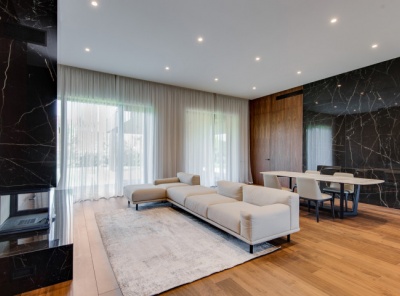 Аренда загородного дома площадью 1000 кв.м. Новорижское шоссе, 9 км от МКАД. Коттеджный поселок Третья Охота. Дом построен в 2 этажа, выполнена качественная отделка. Из панорамных окон открываются живописные виды на хвойный лес. Полностью меблирован и оснащён бытовой техникой. Подходит для постоянного проживания большой семьи. Планировочное решение дома включает просторную гостиную с камином, кухню, кабинет, 4 спальни с санузлами, Спа-зону с сауной и тренажерным залом, гараж на 4 м/м, винный погреб.