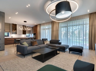 Предлагается в продажу роскошный 3-х уровневый пентхаус площадью 425 квадратных метров с открытой террасой. Пентхаус полностью меблирован и оборудован: посуда, кухонная техника, текстиль, декор и аксессуары от премиальных мировых брендов.Проект в жилом комплексе Доминион победил сразу в 2-х номинациях International Property Awards: Лучший проект по реновации пространства и Лучший проект по дизайну интерьера.В оформлении гостиной преобладают нейтральные, пастельные тона.