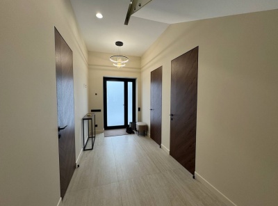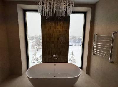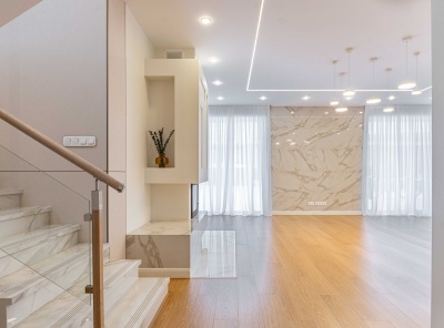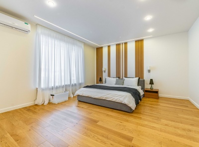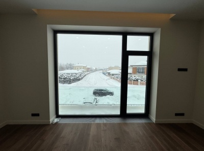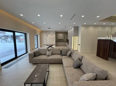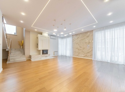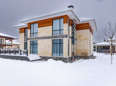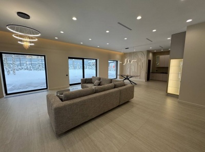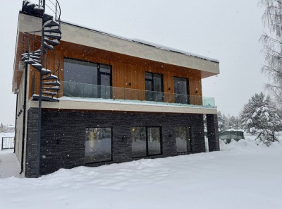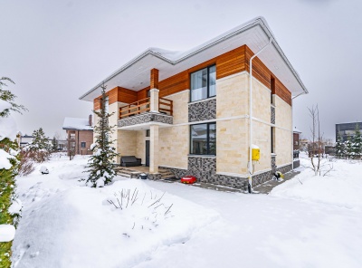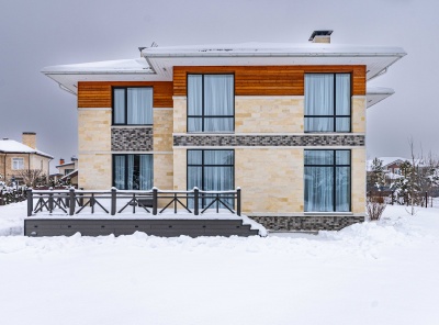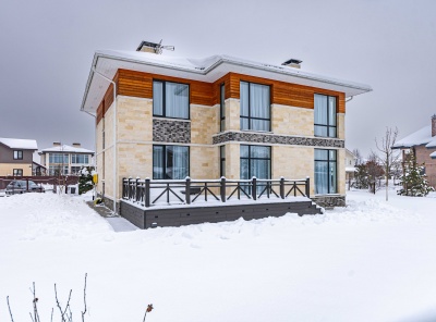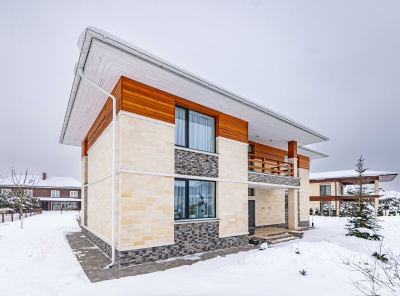 Продажа нового загородного дома общей площадью 385 кв.м. Новорижское шоссе, 23 км от МКАД. Коттеджный поселок Новорижский. Дом построен в 2 этажа по современному европейскому проекту в стиле Хайтек с панорамным алюминиевым остеклением в лучшей части поселка. Фасад выполнен из натурального камня с элементами массива лиственницы. Интерьер выполнен в современном стиле в светлых тонах. Из хозяйской спальни с одной стороны открывается великолепный вид на озеро и парк, а с другой на лесной массив.