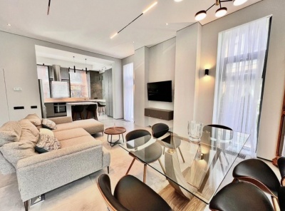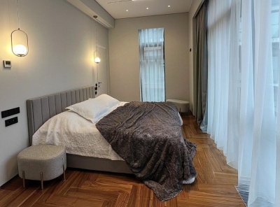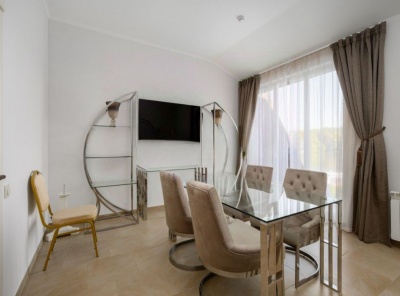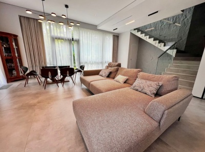 Продажа таунхауса площадью 250 кв.м. Новорижское шоссе, 23 км от МКАД. Коттеджный поселок Футуро Парк. Построен в 4 этажа. Выполнен в современном архитектурном стиле с просторными, светлыми помещениями и панорамным остеклением, которое наполняет интерьер естественным светом и визуально расширяет пространство. Внутри выполнен качественный ремонт с использованием современных материалов. Полы отделаны крупноформатным керамогранитом, потолки с встроенным освещением и стильными светильниками.