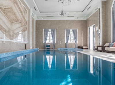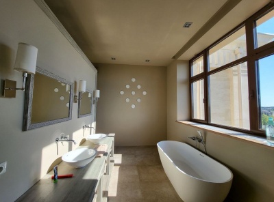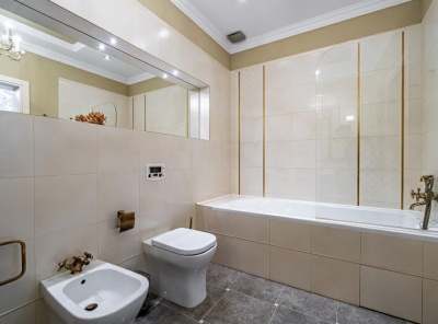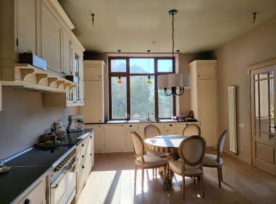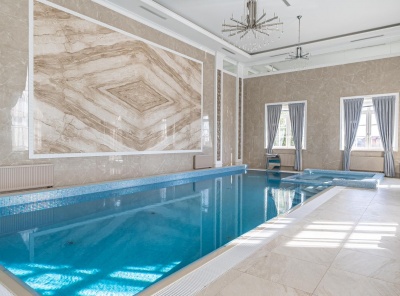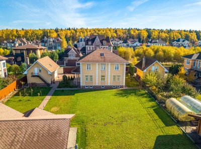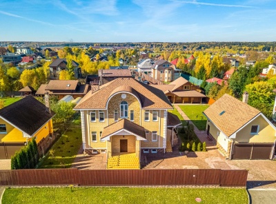 Продажа загородного дома площадью 620 кв.м. Коттеджный поселок Русская деревня. Новорижское шоссе, 24 км от МКАД. Дом площадью 350 кв.м. построен в 2 этажа из кирпича, фундамент и перекрытия монолит, кровля - мягкая черепица. Полы - высококачественный шведский ламинат, плитка - тёплый пол. Высота потолков - 3.10 м. На участке расположен банный комплекс 150 кв.м. из бревна с бассейном и джакузи, гараж 120 кв.м. на 2 м/м и квартирой для персонала. Участок 20 соток, уложен газон.