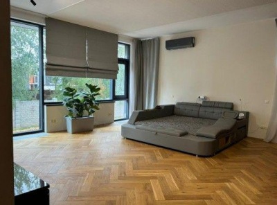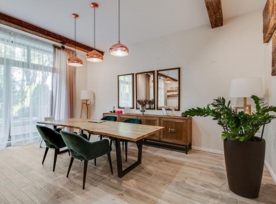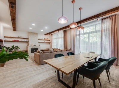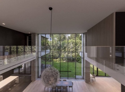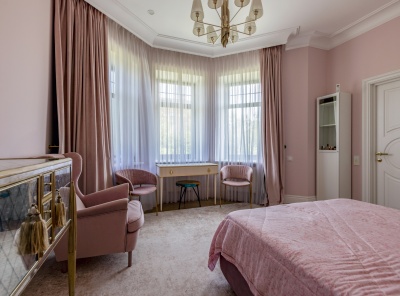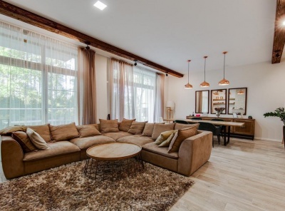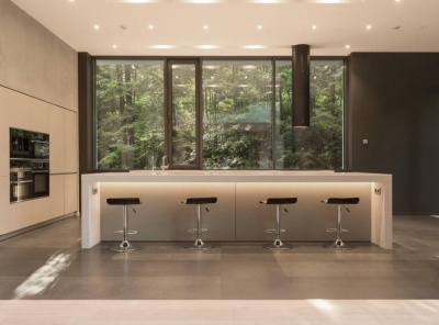 Аренда загородного дома площадью 770 кв.м. Новорижское шоссе, 9 км от МКАД. Коттеджный поселок Никольская Слобода. Коттедж построен в 2 этажа, под ключ. Современный дом в стиле хай-тек с выразительной архитектурой и панорамным остеклением. Фасад выполнен в сочетании светлого камня и темных металлических элементов, что придает зданию элегантность и строгость. Большие окна от пола до потолка обеспечивают максимум естественного света и создают ощущение открытости и гармонии с природой.