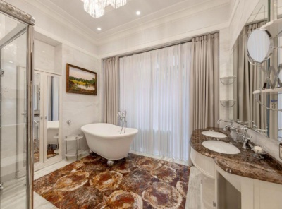 БАССЕЙН!! Продажа загородного дома общей площадью более 1400 кв.м. Дом построен в 4 этажа. С лифтом! Отделка натуральным камнем в классическом стиле: наборный паркет, дубовые панели, натуральный мрамор, гипсовая лепнина, мозаика, бронза, много оригинальной живописи. Мебель дорогих итальянских фабрик. На облагороженном участке 55 соток с открытым теннисным кортом, фонтаном, прудом и летней ротондой. Ночная подсветка дома и освещение участка. Так же на участке гараж на 4 машины и сервисный дом (120 кв. м.