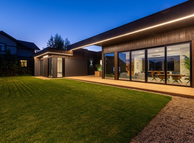 Продажа загородного дома общей площадью 400 кв. м. Новорижское шоссе, 23 км. от МКАД. Коттеджный поселок Новорижский. Одноэтажный проект построен под ключ на солнечном участке в лучшей локации поселка. Прекрасный вид на участок обеспечивают энергоэффективные панорамные окна из алюминия. Выполнен отличный, авторский дизайн с высококачественной отделкой в стиле функционального минимализма.