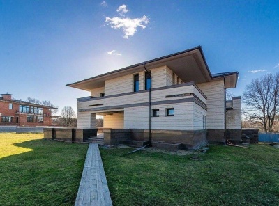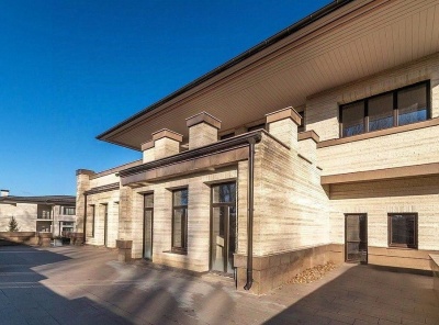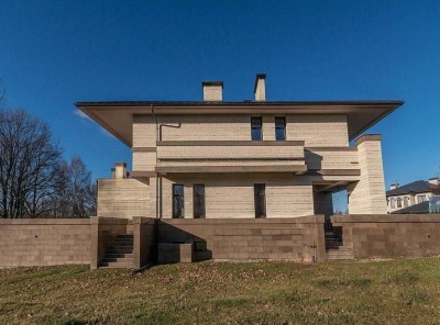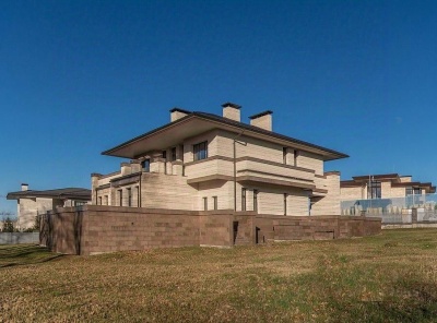Продажа загородного коттеджа под отделку площадью 1030кв.м. Коттеджный посёлок Барвиха - XXI. Рублёво-Успенское шоссе, 6 км от МКАД. Дом построен в 2 этажа и 3 уровня. Дом выполнен в стиле Фрэнка Ллойда Райта. Фасады облицованы гранитными плитами и плиткой из декоративного бетона. Участок 34 сотки, правильной формы. На участке есть отдельно стоящий гараж на 2 авто и комнатой охраны.