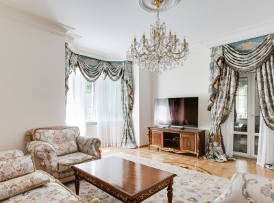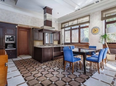 Продажа загородного дома общей площадью 700 кв.м. Поселок Жуковка, Рублево- Успенское шоссе, 9 км от МКАД. Дом построен в 4 уровня в английском стиле под ключ с мебелью. Выполнена качественная отделка в классическом стиле. Тихое место. На ухоженном лесном участке 19 соток с хвойными деревьями расположен гараж с блоком для персонала.