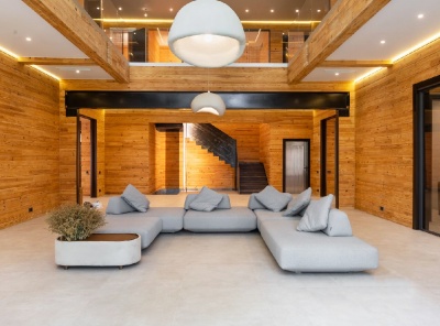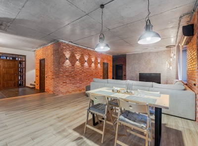 Продажа загородного дома площадью 590 кв.м. Новорижское шоссе, 27 км от МКАД. Коттеджный поселок Крона. Современный кирпичный коттедж с новой качественной отделкой под ключ. Интерьер дома выполнен в стиле Loft. В отделке стен использован АРТ-Бетон с индивидуальной техникой нанесения для каждого помещения. В доме высокие потолки, панорамное остекление, частично установлена мебель. Работает кондиционирование и система отчистки воды. На солнечном участке 19 соток сделан дренаж и ливневка.