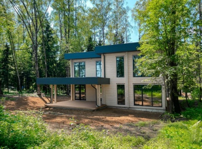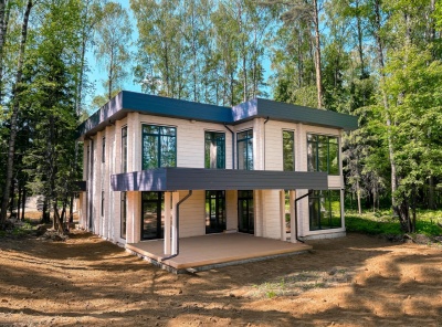 Продажа загородного дома площадью 480 кв.м. Новорижское шоссе, 25 км от МКАД. Коттеджный поселок Лесные зори. Дом построен в 2 этажа. Современный дизайн с плоской крышей и правильными формами, материал построек клееный брус 270/200 мм, хвойных пород из северных областей России. Участок 27 соток. Сдача дома август-сентябрь 2022 года.