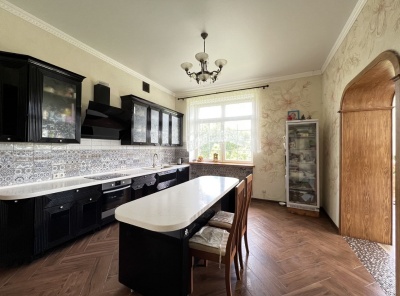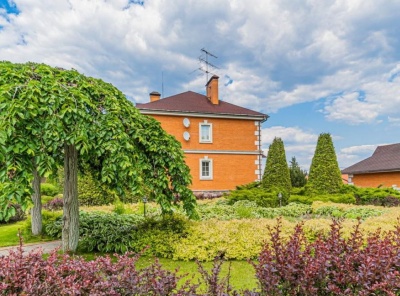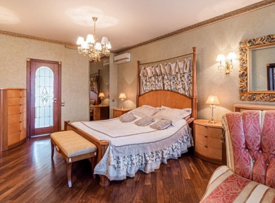 Продажа загородного дома площадью 450 кв.м. Новорижское шоссе, 27 км от МКАД. Коттеджный поселок Павловская Слобода. Изысканный дом с дизайнерским ремонтом, где продумана каждая мелочь интерьера. На стенах панно и лепнина, авторские светильники и люстры из бронзы. Перила кованые по эксклюзивным эскизам. Полы из красного дерева. Мебель ручной работы из ценных пород дерева. Витражные авторские стекла в интерьере. Удобное расположение комнат: есть спальня на первом, в мастер - спальне отдельный санузел.