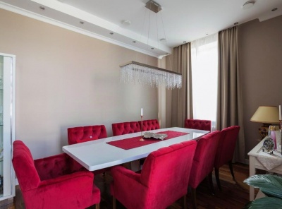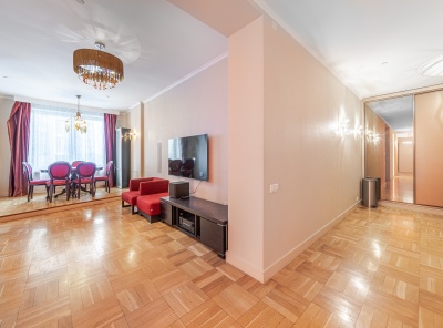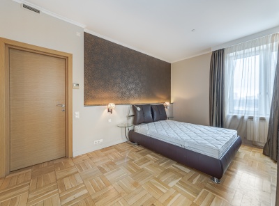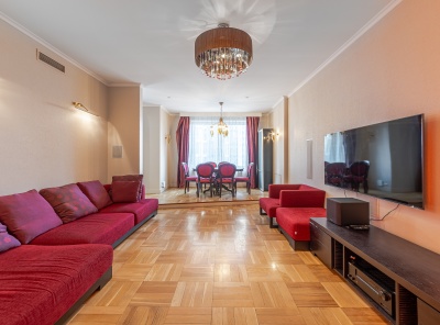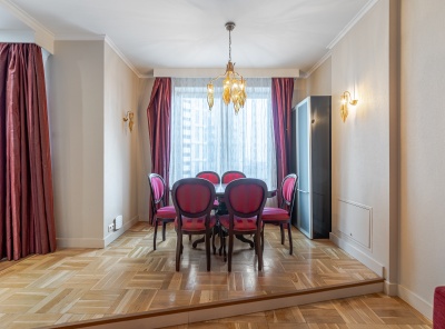 Аренда 4-комнатной квартиры площадью 190 кв.м. с дизайнерским ремонтом в современном стиле. Метро Университет, 1 минута пешком. Ломоносовский проспект, дом 25к3. ЖК Доминион. Окна гостиной и кухни выходят на главное здание МГУ, спальни выходят во двор. Квартира полностью меблирована. Кухня оборудована современной бытовой техникой. В отделке квартиры использованы дорогие и ценные материалы: мрамор, натуральный камень, различные породы дерева, текстильные обои. Четыре машиноместа входят в стоимость. Охраняемая территория.