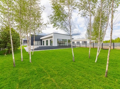 Продажа загородного коттеджа площадью 210 кв.м. Новорижское шоссе, 33 км от МКАД. Коттеджный поселок Люкс-Проект. Коттедж построен в 1 уровень, отделка Whitebox. Современный дизайн, панорамное остекление, просторные комнаты, высокие потолки. Все центральные коммуникации, газовый котел. Участок 11 соток. Охраняемый поселок.Планировка:Холл, кухня-столовая-гостиная, кабинет, с/у, спальня с гардеробной и ванной комнатой, 2 спальни, гараж на 1 м/м.