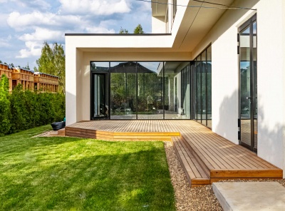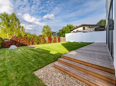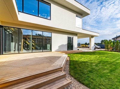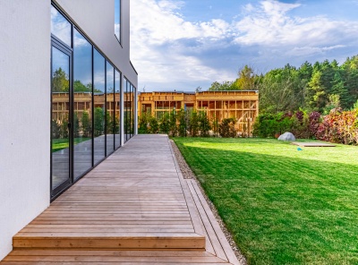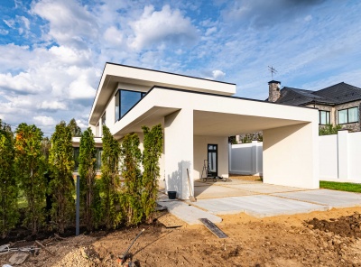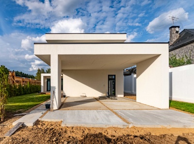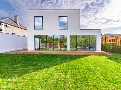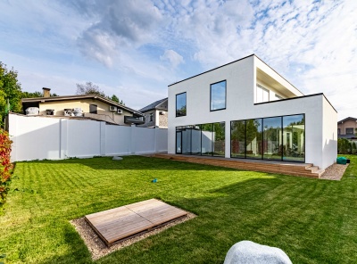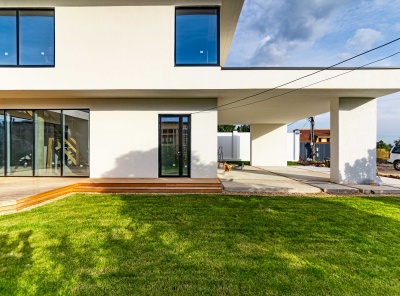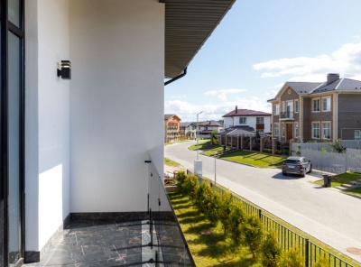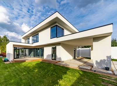 Продажа загородного дома площадью 340 кв. м. Новорижское шоссе, 25 км. от МКАД. Деревня Славково. Предлагается стильный дом, построенный в современном архитектурном стиле с плоской кровлей. Элегантный фасад выполнен из декоративной штукатурки, что подчеркивает лаконичные формы и гармонично сочетается с окружающим ландшафтом. Участок благоустроен: выполнено озеленение, предусмотрены зоны для отдыха и прогулок. Большие панорамные окна наполняют помещения естественным светом и открывают великолепные виды на лес и реку.