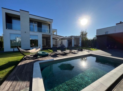 Продажа загородного дома площадью 300 кв.м. Новорижское шоссе, 23 км от МКАД, КП Новорижский. Дом построен в 2 этажа в современном стиле Хайтек. Интерьер выполнен в стиле минимализм с использованием дорогостоящих материалов. Потолки 3.2 метра с увеличенными проемами под двери и панорамные окна, дают ощущения простора загородного дома. Участок 6 соток расположен в лучшей локации поселка в 2 мин от пруда и детских площадок. Так же на участке уложен газон, организован ландшафт. Навес на 2 м/м. Все коммуникации центральные.