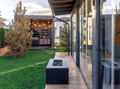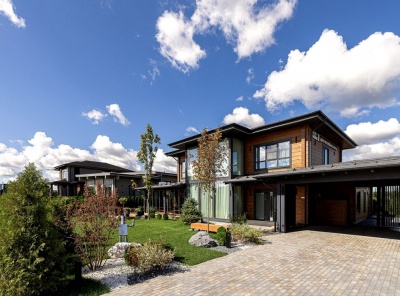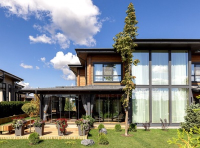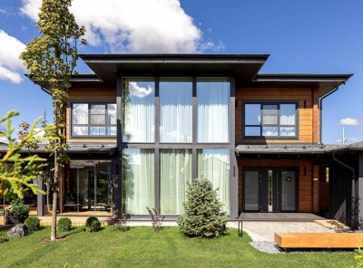 Продажа загородного дома площадью 354 кв.м. Коттеджный поселок Павловы Озера. Новорижское шоссе, 18 км от МКАД. Этот современный двухэтажный дом сочетает в себе стильную архитектуру, простор и уют. Фасад выполнен в гармоничном сочетании натурального дерева и темных акцентов, что придает зданию выразительность и современный характер. Главной особенностью являются панорамные окна в полный рост, которые заливают интерьер естественным светом и визуально объединяют дом с окружающей природой.