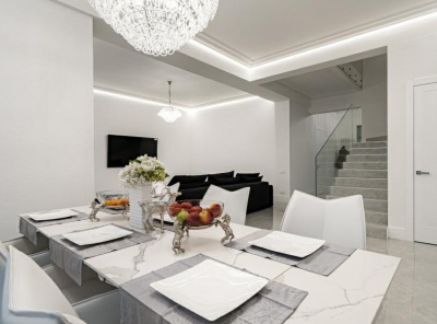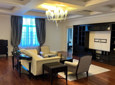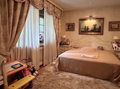 Аренда загородной квартиры общей площадью 168 кв.м. Новорижское шоссе, 20 км от МКАД. Коттеджный поселок Агаларов Эстейт. Просторная квартира расположена на третьем этаже трехэтажного дома. Интерьер оформлен в классическом стиле, в отделке использованы обои, паркетная доска из массива ореха, мрамор, сантехника Villeroy&Boch, испанские смесители и аксессуары Devon&Devon в санузлах.Резиденция укомплектована мебелью, светильниками, кухонным гарнитуром изИталии, Англии и США, установлена бытовая техника AEG, Liebherr иSide-by-Side.